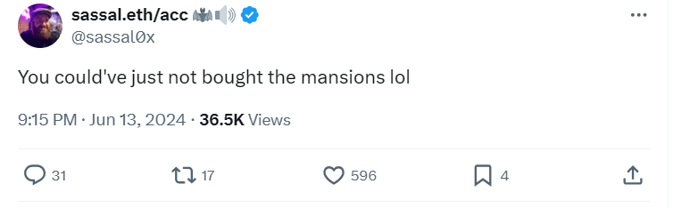 «Ты мог бы просто не покупать особняки», — так прокомментировал ситуацию Ethereum-разработчик @sassal0x.