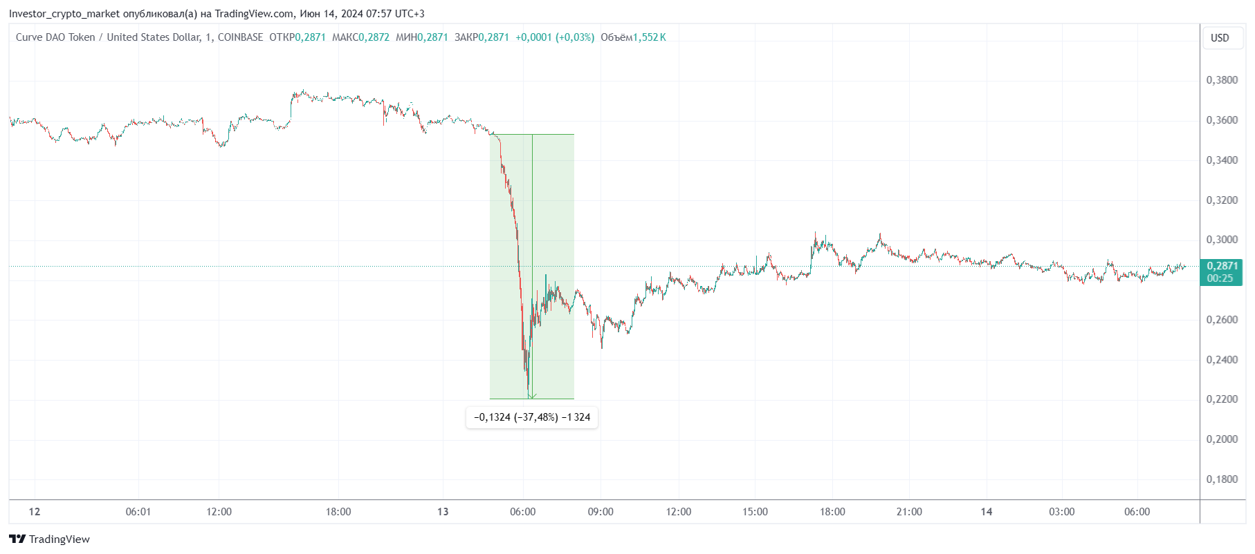 13 июня 2024 года токен CRV децентрализованного протокола Curve Finance вышел в падение, глубина которого в моменте превысила 37%. После криптовалюта реализовала небольшую коррекцию.