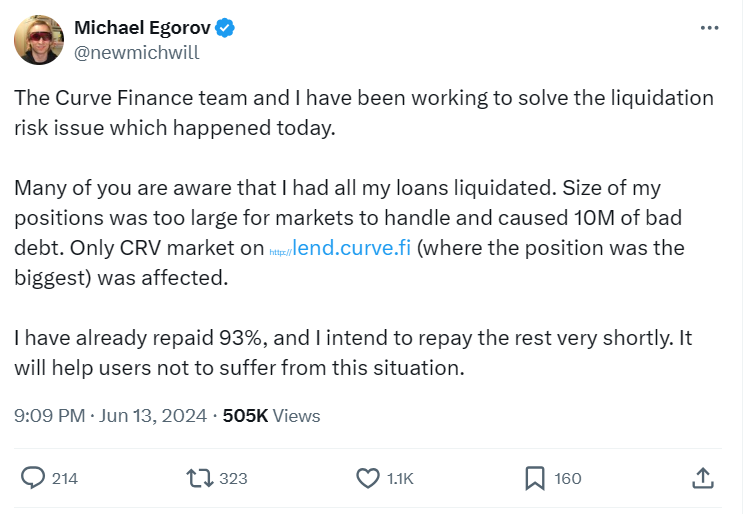 Бизнесмен утверждает, что команда Curve Finance работает над решением проблемы ликвидационного риска. Также Егоров уверяет подписчиков в том, что он уже погасил 93% своих долгов и намерен скоро разобраться с оставшейся частью.
