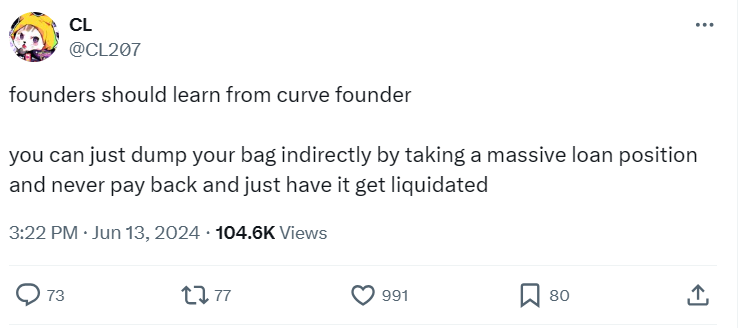 Часть участников криптосообщества видит в Curve бомбу замедленного действия, которая может рвануть. К сожалению, криптоиндустрия пережила уже множество крахов криптопроектов. Поэтому некоторые криптоинвесторы скептически относятся к позитивным прогнозам Егорова, которого аналитики Lookonchain считают нечистым на руку.