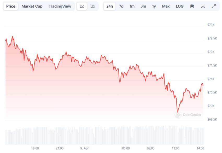 По данным CoinGecko, на момент написания первая криптовалюта торгуется на отметке в $70 809. Вчера цена актива впервые с середины марта поднялась выше $72 тыс., но с тех пор скорректировалась на 2,3%.