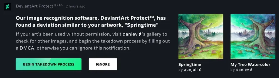 Если инструмент обнаружит идентичное или «почти идентичное совпадение», авторы работ получат уведомление о пиратстве. Бесплатный план позволяет для мониторинга загружать до десяти изображений (общим объемом до 2 ГБ). Платная подписка DeviantArt Core в размере $3,95 в месяц позволяет отслеживать до тысячи изображений общим объемом в 50 Гб.