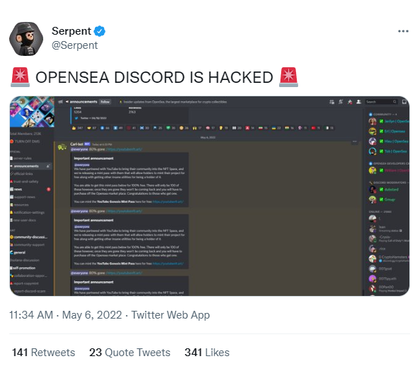 Сервер OpenSea на платформе Discord стал жертвой злоумышленников. Об этом массово сообщают пользователи в твиттере. Согласно опубликованным сообщениям, злоумышленники рекламируют партнерство от лица OpenSea с YouTube прикладывая ссылку на мошеннический сайт.