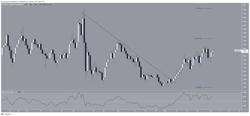 Дневной график демонстрирует, что курс Chainlink в начале января совершил бычий пробой линии нисходящего сопротивления. После этого цена достигла максимума на $7,52. Это произошло 29 января.