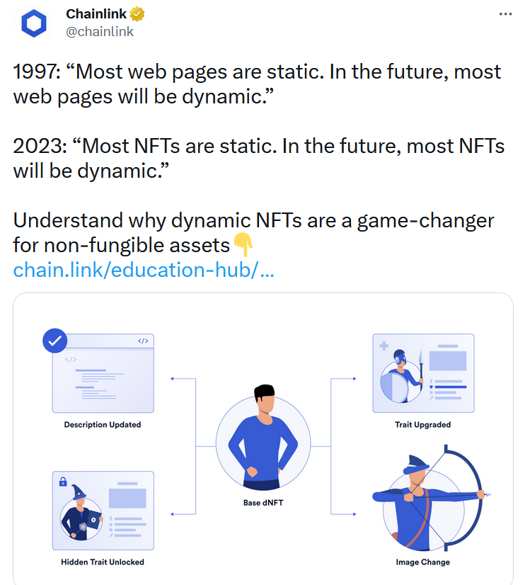 «1997 год: Большинство веб-страниц статичны. В будущем большинство веб-страниц будут динамическими. 2023 год: Большинство NFT статичны. В будущем большинство NFT будут динамическими. Поймите, почему динамические NFT меняют правила игры для невзаимозаменяемых активов».