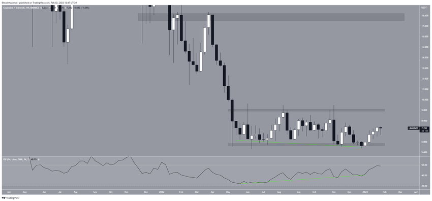Между тем результаты технического анализа показывают, что коин Chainlink с мая 2022 года торгуется над областью горизонтальной поддержки $5,75. Хотя цена достигла минимума на $5,30, ей все равно удалось удержаться над поддержкой $5,75 на недельном таймфрейме, избежав закрытия ниже этого уровня.