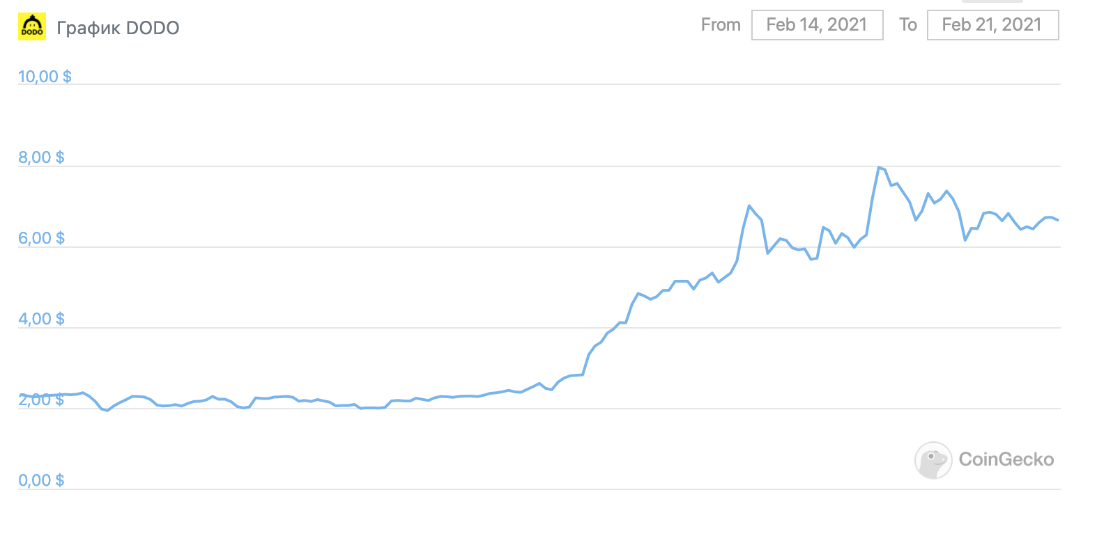 Отметим, что проект DoDo Dex не имеет ничего общего с сетью пиццерий и является децентрализованным криптовалютным обменником и поставщиком ликвидности. Токен Dodo занимает 92 строчку в рейтинге CoinGeko и торгуется на уровне $6,6.