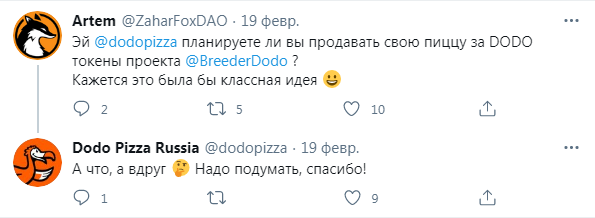 Пользователи предложили пиццерии Додо Пицца объединиться с децентрализованной биржей DODO. Пиццерия ответила, что подумает.