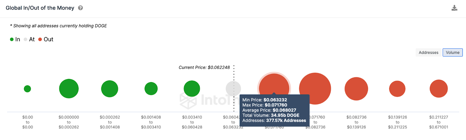 На графике ниже показано, что 377 570 адресов купили 35 млрд токенов по средней цене $0,068. Фиксация ими прибыли может свести начинающееся ралли на нет. Однако если быки соберутся с силами, Dogecoin может вырасти до $0,08.
