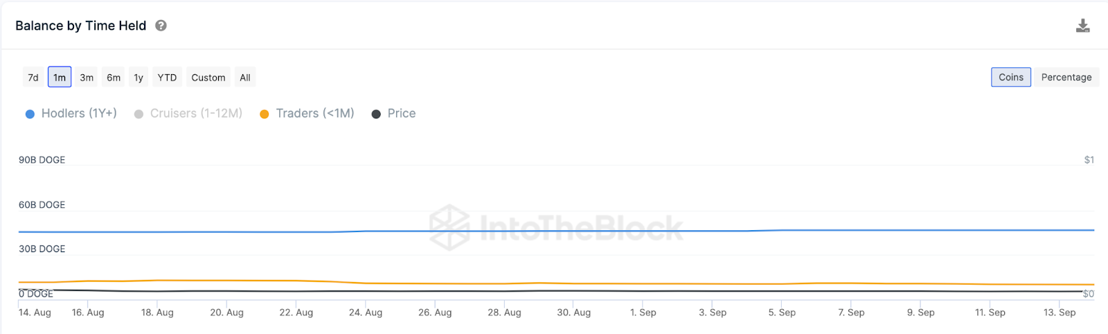 Согдасно информации аналитической платформы IntoTheBlock, в период с 14 августа по 15 сентября пользователи, которые удерживают Dogecoin дольше года, приобрели еще 1,2 млрд токенов. Краткосрочные инвесторы, тем временем, продали 1,56 млрд монет.