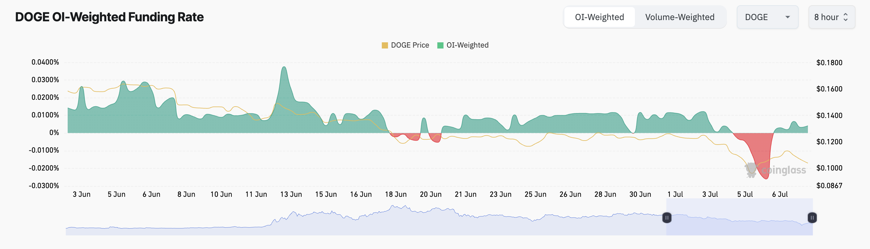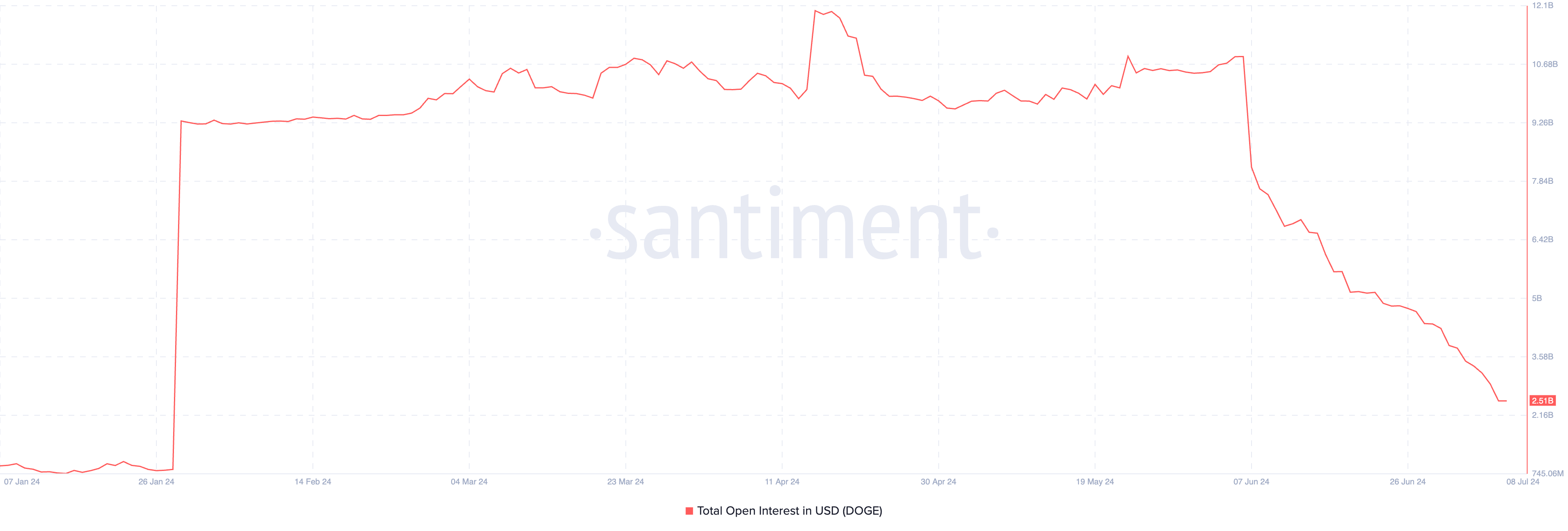 В случае с DOGE открытый интерес составляет $2,51 млрд. Показатель начал снижаться 8 июня и с тех пор упал на 80%. Для сравнения, месяц назад он превышал значение $10 млрд.