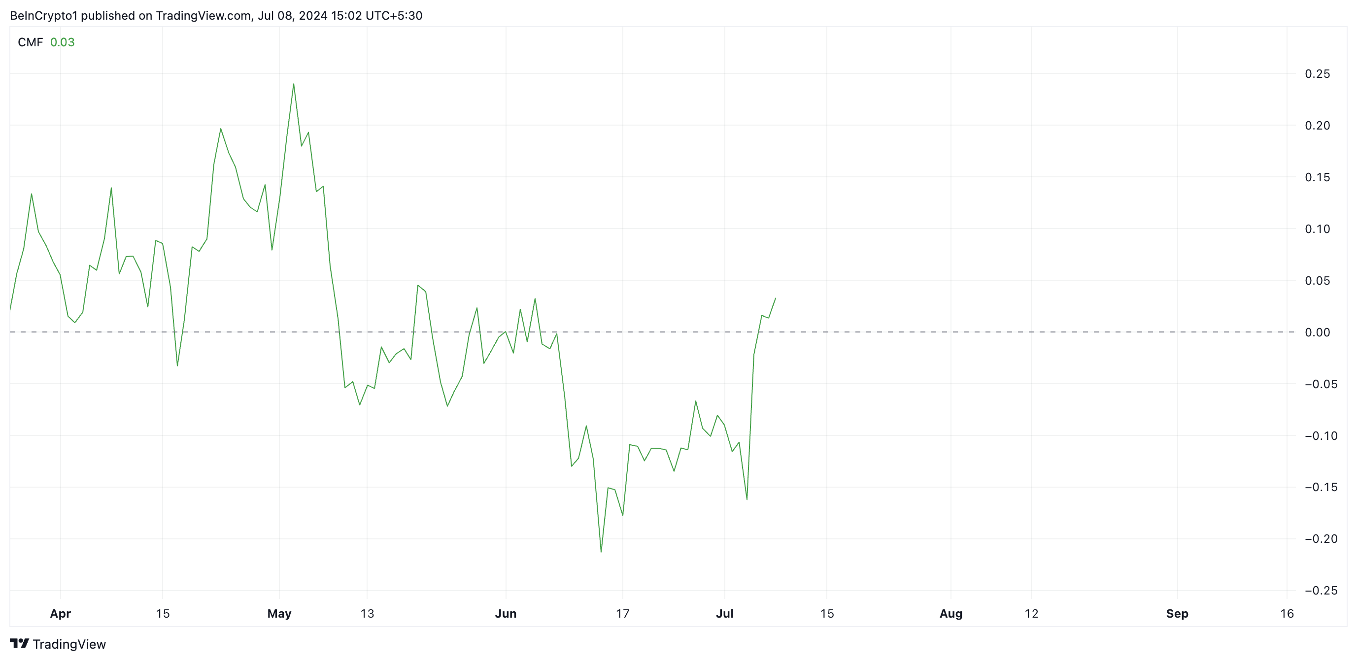 Несмотря на снижение стоимости DOGE, индикатор Чайкина (Chaikin Money Flow, CMF) сохраняет восходящий тренд. На момент написания он находится выше нулевой отметки на уровне 0,03 и продолжает расти.