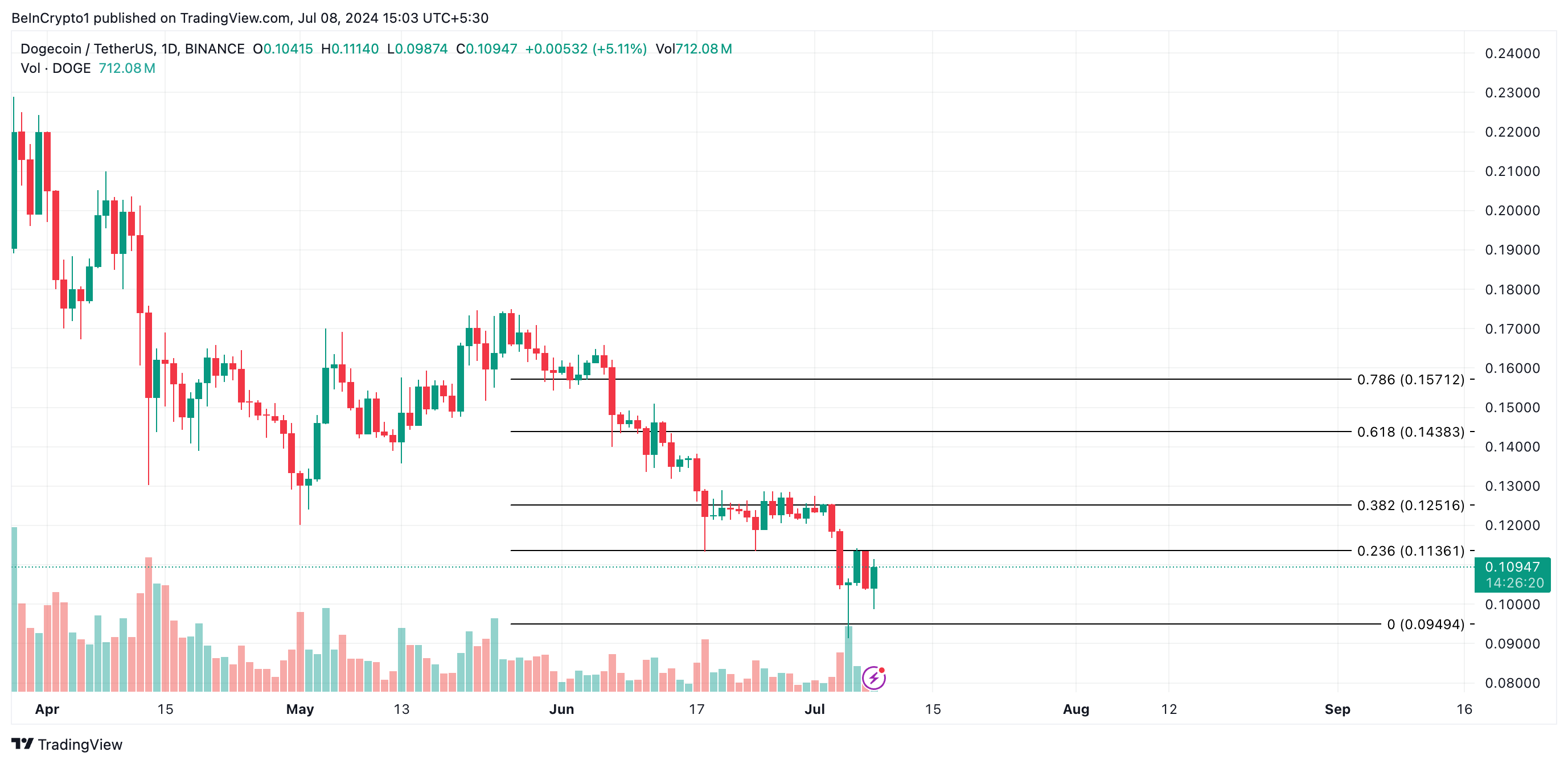 Когда цена падает, а CMF (и объем покупок) растет, это указывает на бычью дивергенцию. Такое расхождение подразумевает, что покупатели аккумулируют актив по сниженным ценам, что может ослабить давление продавцов. Если активность покупателей продолжит повышаться, DOGE может подняться до $0,11.
