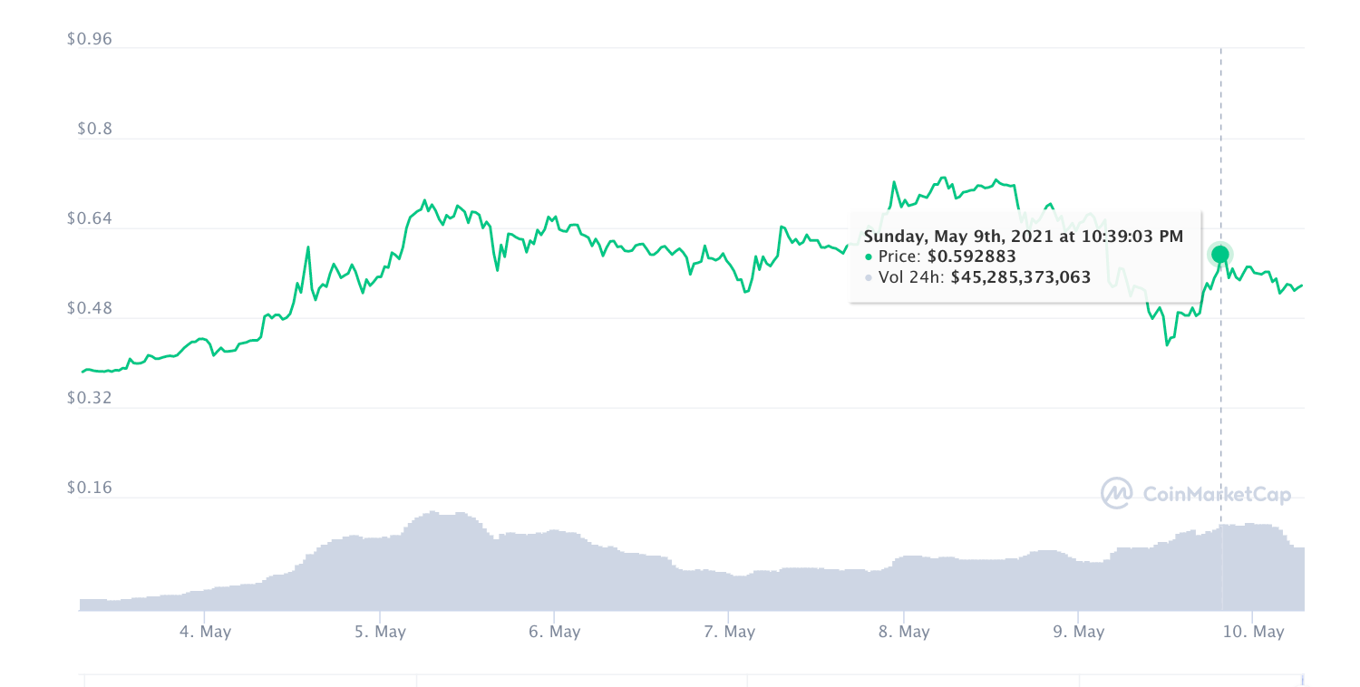 Новость о сотрудничестве с одной из крупнейших корпораций в мире сыграла на руку (или лапу — авт.) самой криптовалюте. Сразу после объявления о совместной миссии цена Dogecoin поднялась до $0,59, частично восстановив потери после 30%-ого обвала к $0,43 в воскресенье, 9 мая. На момент написания статьи DOGE торгуется на уровне $0,54. Монета занимает четвертое место в ретинге криптовалют с капитализацией $70 млрд.