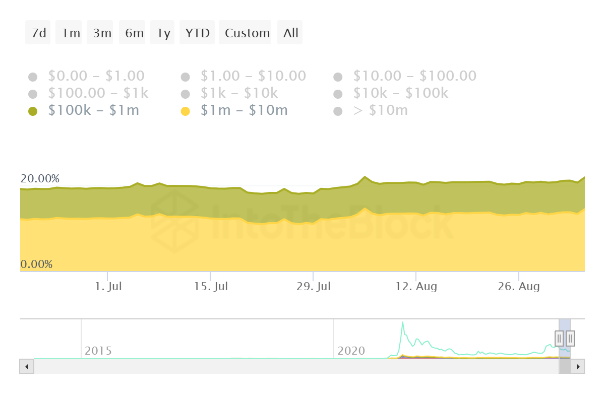 Помимо технических индикаторов, ончейн-метрики также рисуют тревожную картину для Dogecoin. Активность криптовалютных китов заметно снизилась, особенно среди адресов с балансом от $100 000 до $10 млн DOGE. Эти крупные держатели владеют 21% от общего объема предложения DOGE. Однако последние данные показывают почти полное отсутствие аккумулирования за последний месяц.