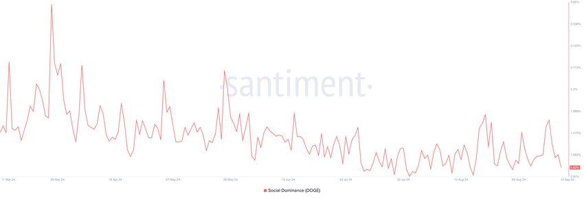Однако в четверг пост не вызвал такой же реакции. Показатель социального доминирования DOGE, который отражает процентное соотношение обсуждений актива в сети по сравнению с обсуждениями ста крупнейших по рыночной капитализации криптовалют, сохраняет тенденцию к снижению. На момент написания он составлял 0,37%.