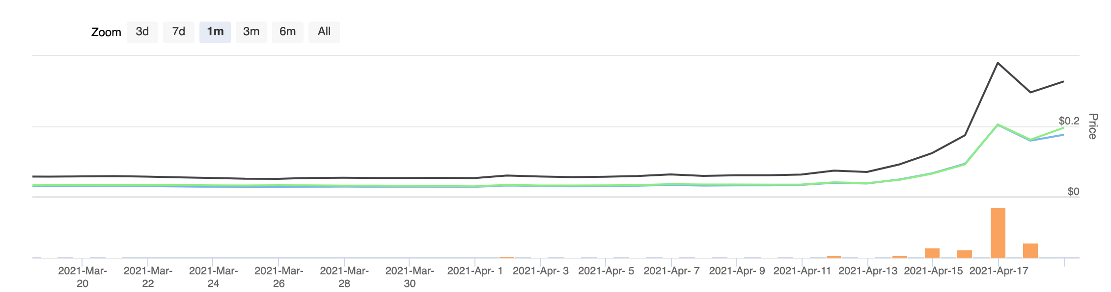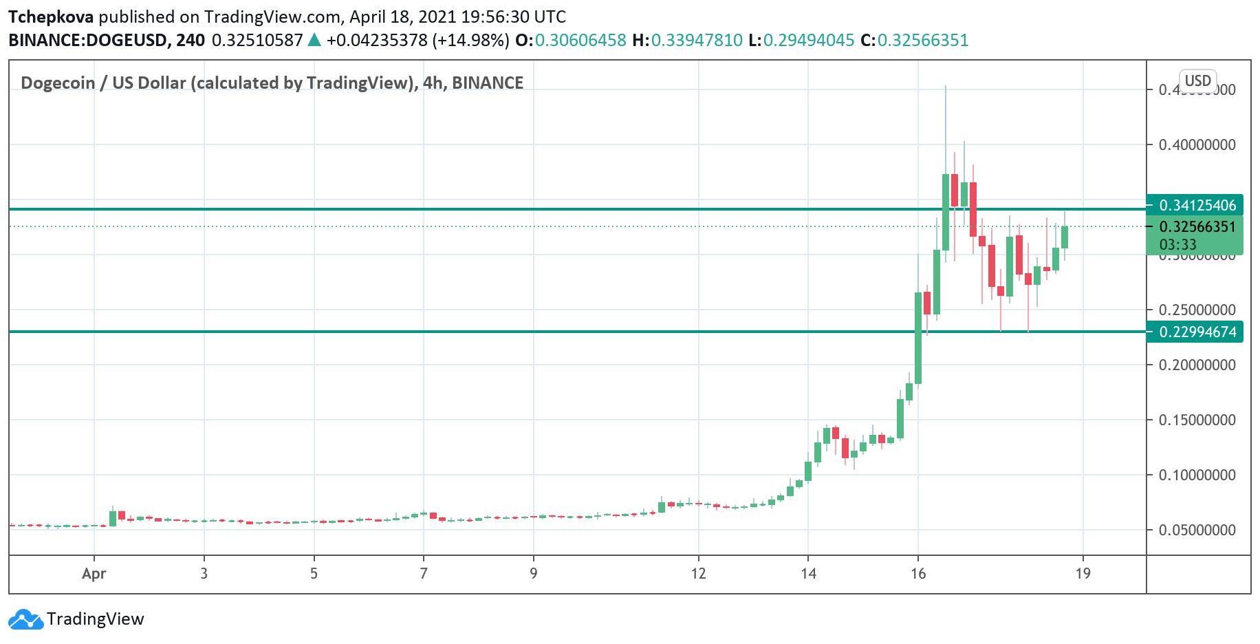 Монета-мем с изображением собаки Шиба Ину продемонстрировала взрывной рост. За сутки с 15 по 16 апреля криптовалюта выросла более чем в три раза, с $0,13 до $0,45. Несмотря на коррекцию, DOGE все еще на 300% выше в недельном исчислении. За год цена актива выросла более чем на 16 000%. На пике Dogecoin вышел в топ-5 монет по рыночной капитализации. Сейчас монета занимает шестую строчку по версии Coinmarketcap с капитализацией $41 млрд.