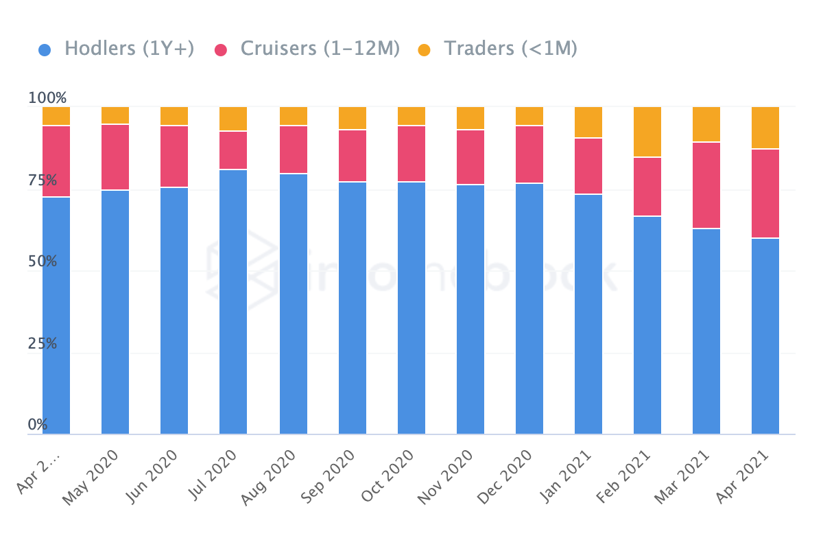 Несмотря на то, что доля долгосрочных держателей DOGE постепенно снижается, они все еще представляют значительную часть всех владельцев монеты. В апреле доля инвесторов, купивших DOGE более года назад, составила почти 60%, а средний период инвестиций превысил пять лет. Между тем, доля краткосрочных трейдеров не превышает 13%, и почти все держатели Dogecoin находятся в прибыли.