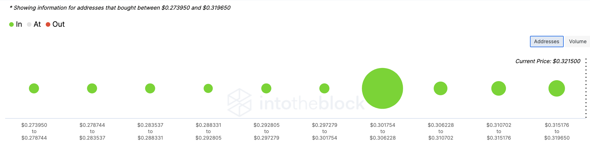 Dogecoin сформировал локальное дно в области $0.23. Цена дважды тестировала эту область поддержки — 17 и 18 апреля — но так и не смогла пробиться ниже и возобновила рост. Однако рост происходит на низких объемах. Показатель достиг пика 17 апреля на уровне $70 млрд и с тех пор снизился к $24 млрд. Такая просадка может свидетельствовать об угасании спекулятивного интереса.