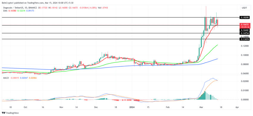 Тем не менее, 50-дневная экспоненциальная скользящая средняя (EMA) все еще остается положительной и проходит под свечой. Если этот уровень продолжит выступать в качестве поддержки, у Dogecoin может появиться шанс на восстановление после отскока от $0,164.