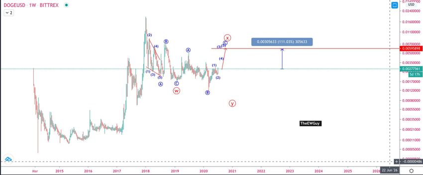 Криптовалютный трейдер @TheEWguy отмечает, что DOGE уже начал бычий ход, который продолжится до $0.0059. В оде вчерашнего ралли цена достигла уровня $0.0055 (60 сатоши), так что эта цель уже достигнута.