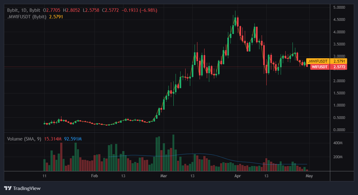 За несколько месяцев рыночная стоимость dogwifhat превысила отметку в $2,5 млрд. Тем временем, по данным TradingView, цена токена в общей сложности увеличилась более чем на 2 700%.