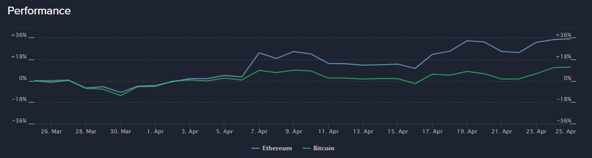 SponsoredНаибольший разрыв был зафиксирован 19 апреля, когда доходность ETH составляла 34%, а BTC — 8%. На момент написания материала, разрыв сократился с 26% до 24%.