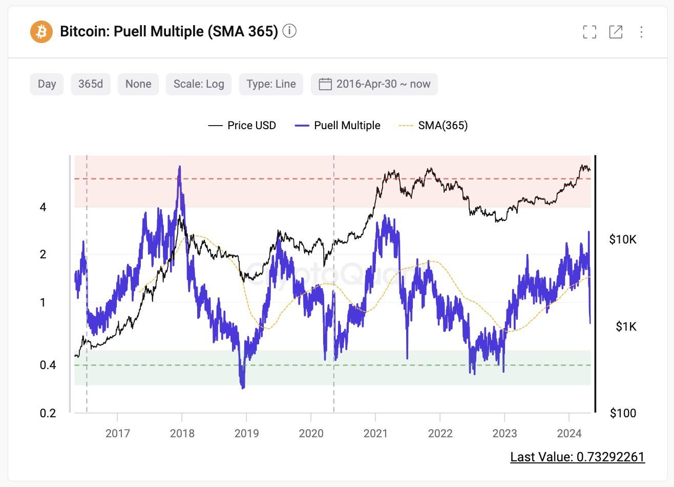 Однако сейчас майнеры делают ставку на будущее восстановление цен. Об этом говорит анализ метрики мультипликатор Пьюэлла, которая указывает на долгосрочные рыночные циклы BTC на основе доходности майнеров.