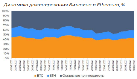 Доминирование биткоина (BTC) по итогам июня сократилось на три процента. К такому выводу пришли в криптобирже EXMO. Помимо биткоина, падение зафиксировал и ether (ETH), который тоже потерял три процента по итогам прошедшего месяца.
