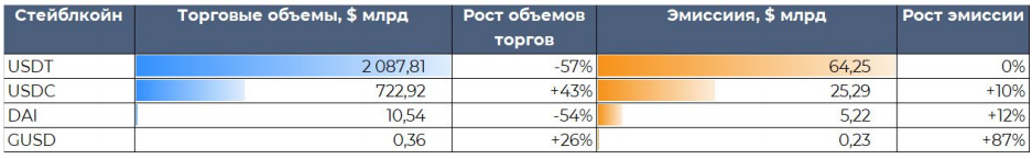 Например, объемы торгов крупнейшего по рыночной капитализации стейблкоина tether (USDT) по итогам июня зафиксировали падение на 57% до $2 трлн. Более того, одноименная компания-эмитент Tether за июнь не выпустила ни одного токена, отмечают в EXMO.