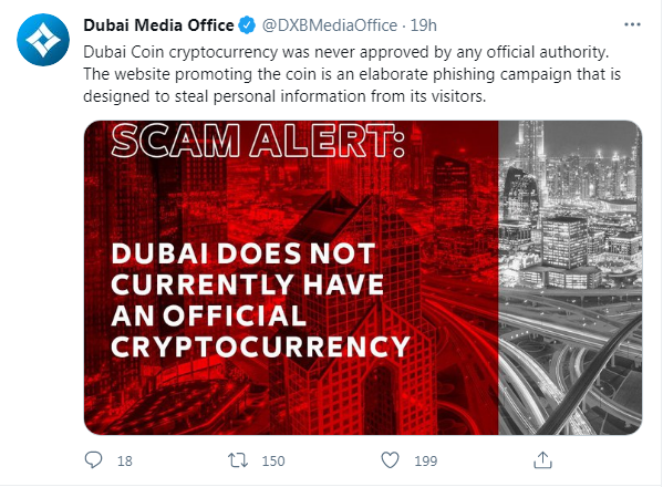 «Криптовалюта Dubai Coin никогда не была одобрена никакими официальными властями. Веб-сайт, продвигающий монету, представляет собой тщательно продуманную фишинговую кампанию, предназначенную для кражи личной информации посетителей», — говорится в сообщении.