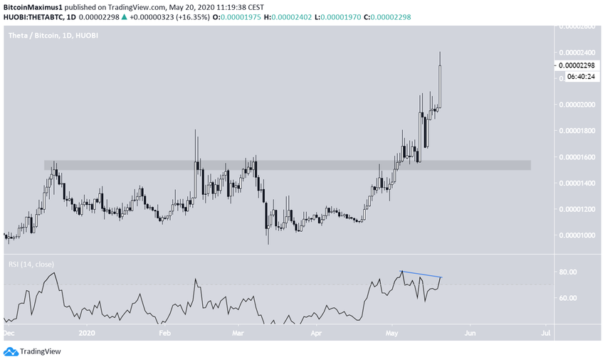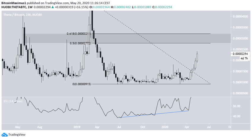 Как и в случае с RVN, более долгосрочный график THETA говорит в пользу продолжения бычьего хода. До начала подъема недельный RSI подавал сильные сигналы бычьей дивергенции.