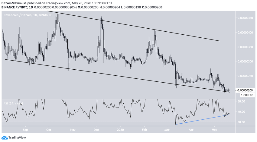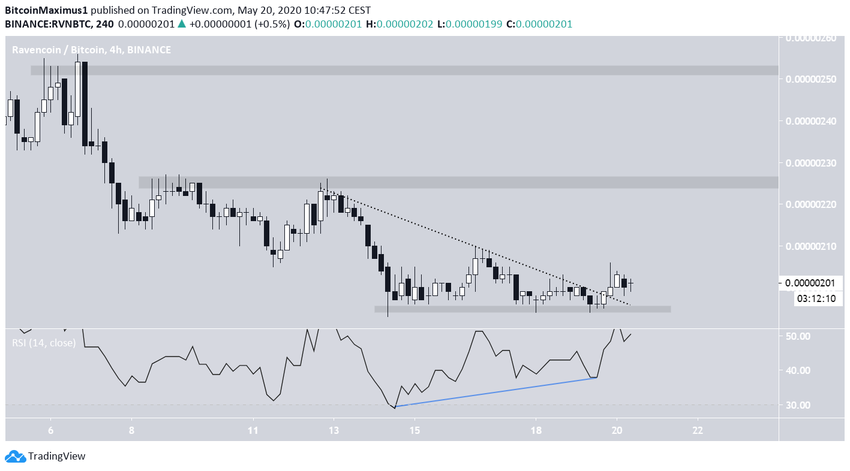 Более того, RVN сформировал тройное дно, которое сочетается с сигналами бычьей дивергенции со стороны RSI. Это признак того, что цена может подняться еще выше. Первый уровень сопротивления расположен на 225 сатоши, а следующий – в зоне 250-255 сатоши, о чем говорится в твите трейдера.