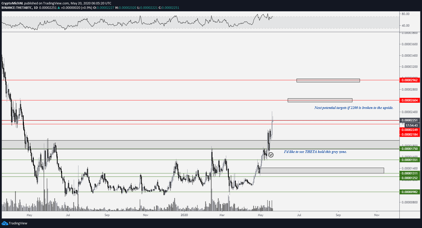 Еще оддин интересный альткоин, на которрый стоит обратить внимание – THETA. Монета уже пробила важный уровень сопротивления. Трейдер @CryptoMichNL полагает, что пока котировки остаются над зоной поддержи 1800 сатоши, велика вероятность того, что кион попытается протестировать уровень 2600 сатоши и в конечном итоге достигнет уровня 3000 сатоши.