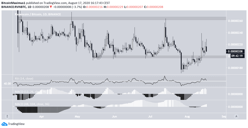 Курс криптовалюты Ravencoin сильно упал 27 июля, но с тех пор восстанавливался. Сначала рост цены застопорился на подходе к области 200 сатоши, которая играла роль поддержки на протяжении двух последних месяцев.