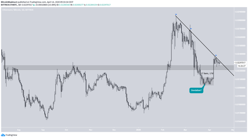 При более тщательном анализе динамики ETH можно увидеть, что цена подтвердила важный уровень поддержки ₿0.0225, который выступал в роли сопротивления с августа 2018 года по февраль текущего года. После его прорыва котировки достигли максимума ₿0.0284, а затем перешли к снижению.