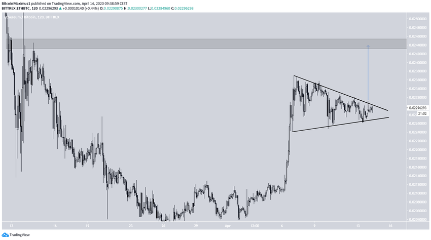 Известный криптовалютный трейдер @PostyXBT опубликовал в твиттере график Ethereum, на котором прослеживается симметричный треугольник. По его словам, монету ждет новая волна роста в направлении сопротивления ₿0.0245.