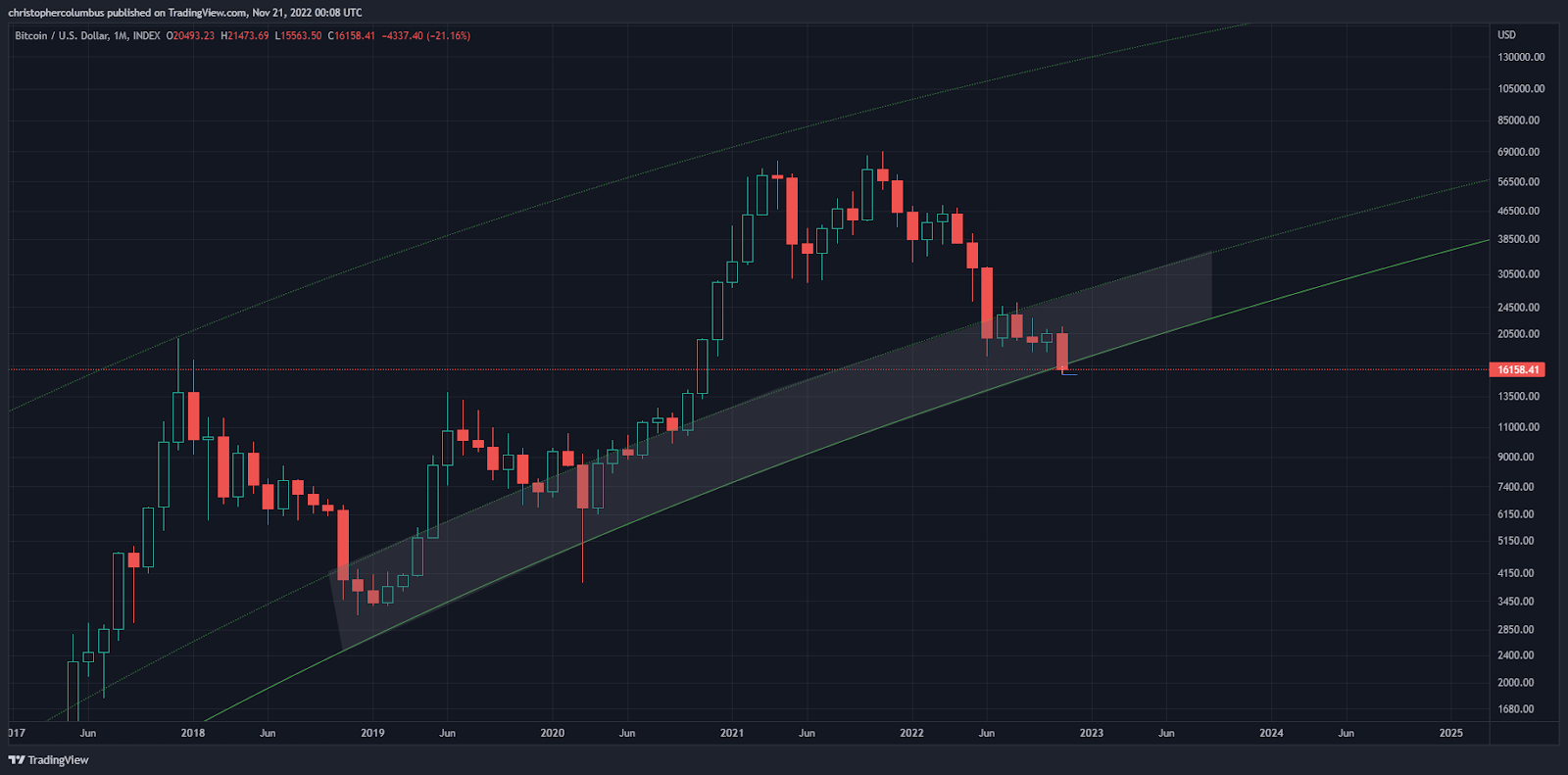 Но нынешнее падение биткоина подрывает все три пункта. Мы не наблюдаем плато, ценовой канал продолжает сужаться, а падение цены BTC на 77% по сравнению с ATH только усиливает гипотезу о циклах биткоина. Да и такие события, как крах Terra (LUNA), Celsius и FTX, показывают, как быстро ликвидность может исчезнуть с криптовалютного рынка.