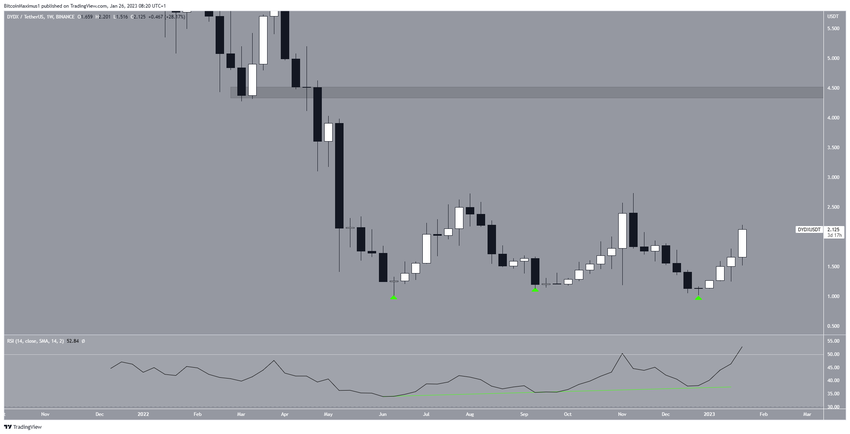 Как показывают результаты технического анализа, курс DYDX с июня 2022 года сформировал тройное основание вблизи минимума 2022 года $1,10. Этот бычий паттерн был также подкреплен сигналами бычьей дивергенции по недельному RSI (зеленая линия).