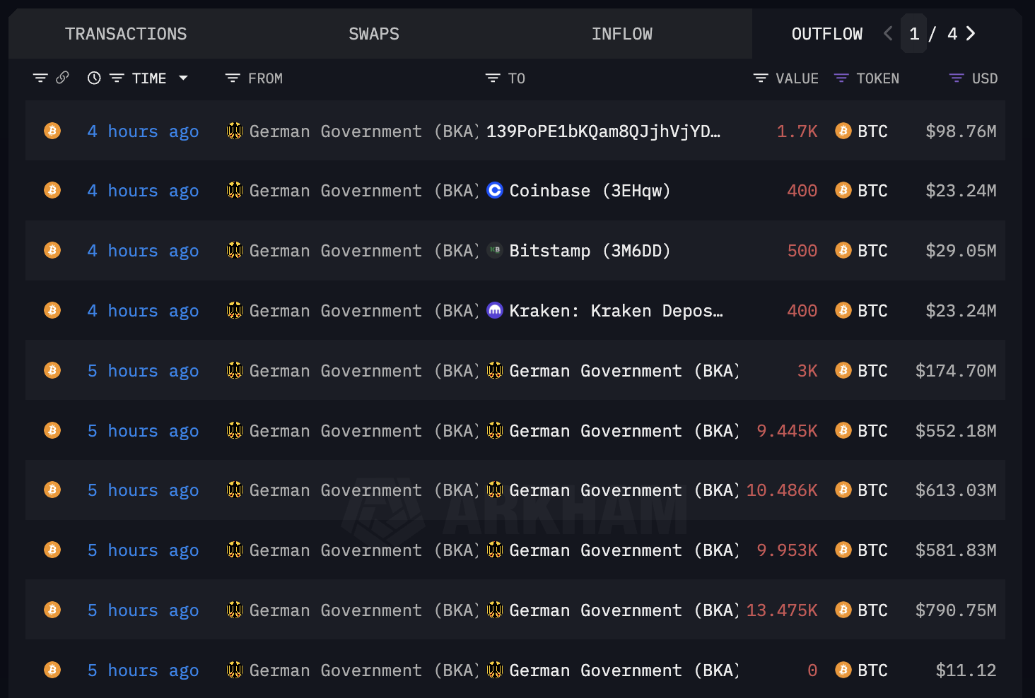 По данным Arkham, 4 июля связанный с Федеральным ведомством уголовной полиции Германии (BKA) адрес перевел на централизованные биржи 1 300 BTC. Из этой суммы 400 BTC владельцы кошелька отправили на Coinbase и Kraken, а 500 BTC — на Bitstamp.