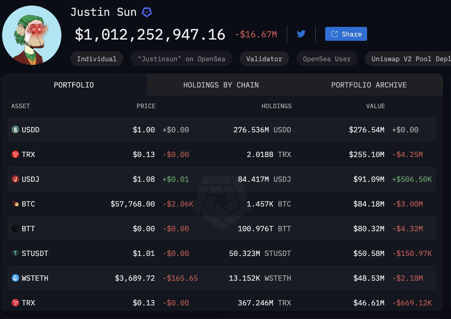 Согласно Arkham, на публично известных личных кошельках основателя Tron хранятся криптоактивы на сумму $1,012 млрд. Ему также принадлежат доли в некоторых криптокомпаниях, акции и несколько невзаимозаменяемых токенов (NFT) из известных коллекций.