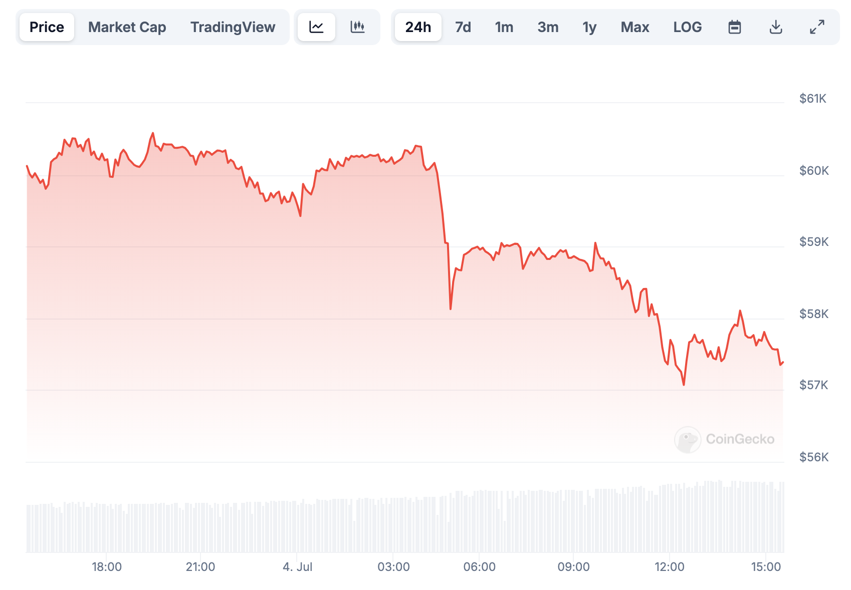 SponsoredПо данным CoinGecko, на момент написания материала BTC торгуется по $57 594. За последние сутки стоимость актива снизилась на 4%.