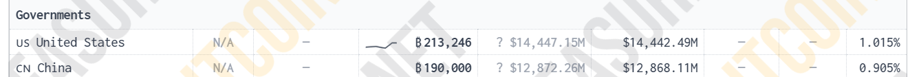 Будучи крупными игроками в глобальной финансовой системе, Китай и США также управляют значительным количеством первой по капитализации криптовалюты. По данным Bitcoin Treasuries, вместе две страны владеют примерно 400 000 BTC, что оценивается в $27,8 млрд по текущему курсу.