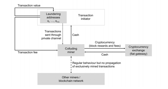 Как поясняют доктора Элиаса Штреле из Исследовательской лаборатории Blockchain и Леннара Анте из Гамбургского университета в своей статье, мошенники могут размещать транзакции через частные каналы и просить майнера или майнинговый пул подтвердить перевод и получить взамен вознаграждение. Таким образом, транзакция остается неучтенной для многих аналитических систем, так как выглядит как награда от добычи криптовалюты.