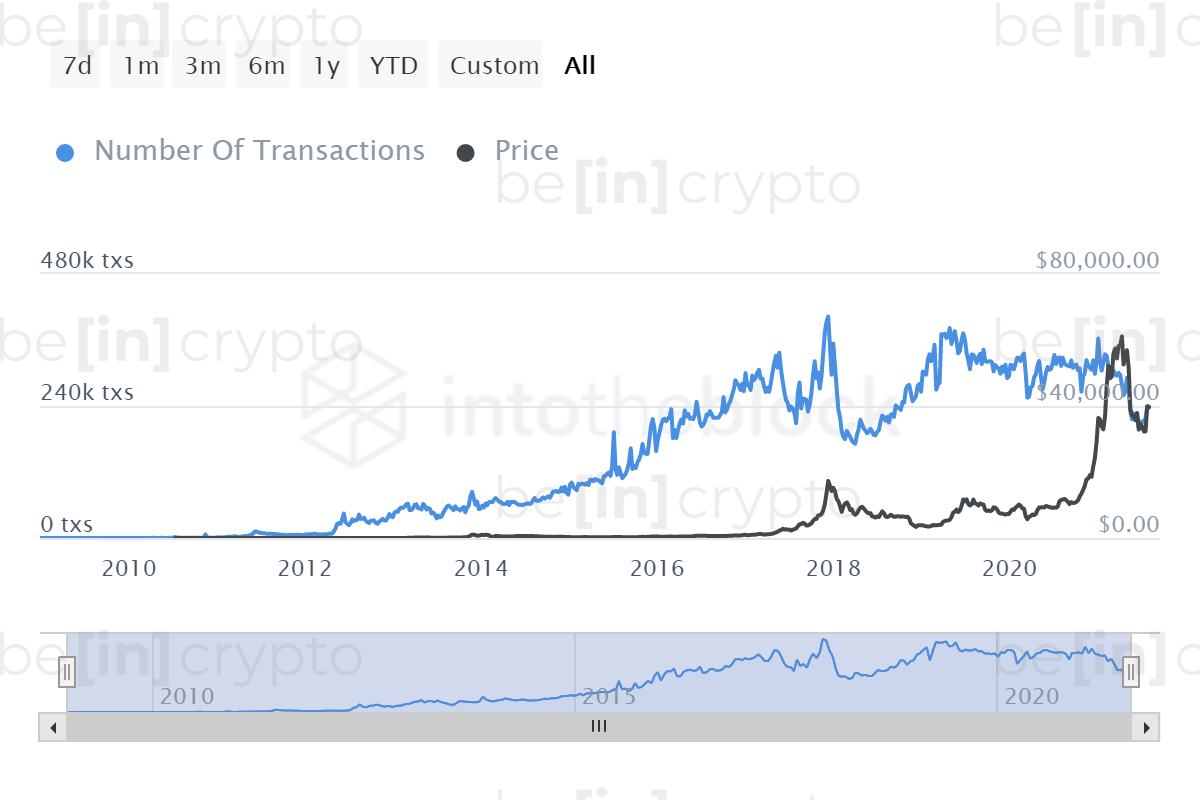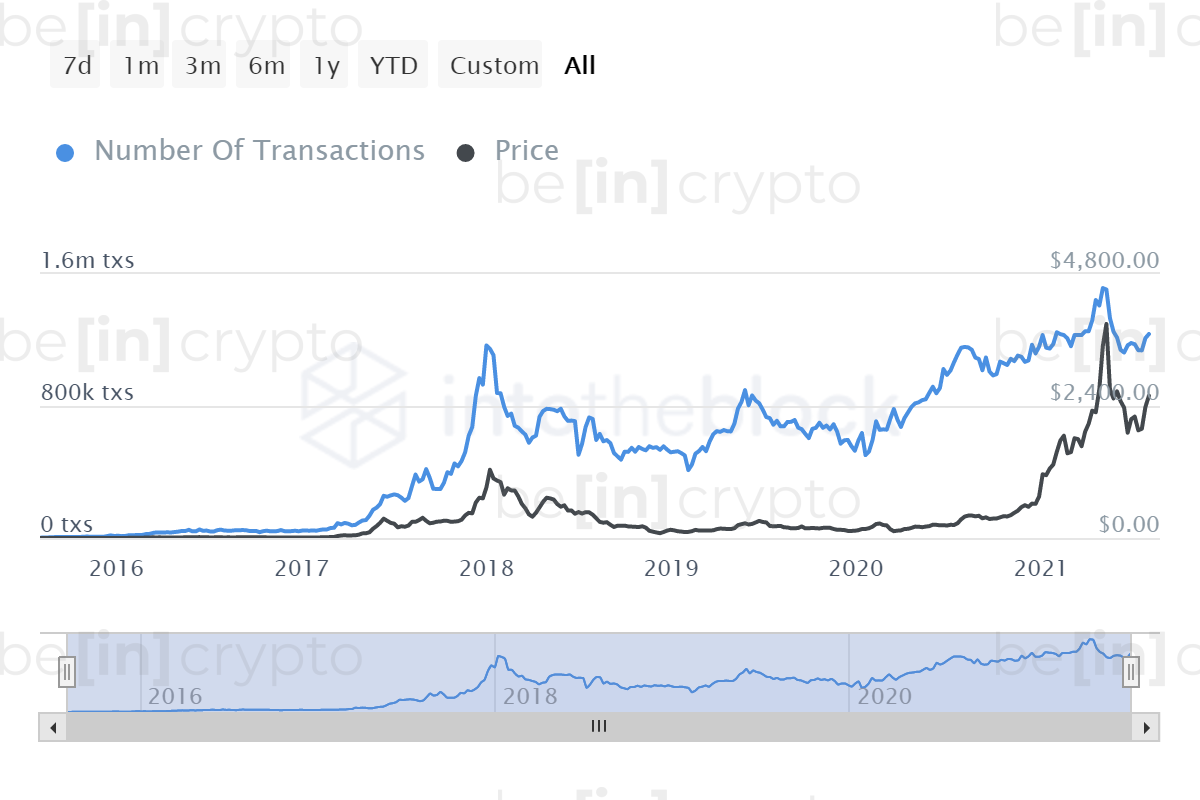 Сейчас цена ETH прямо коррелирует с ончейн-активностью. Как видно на графике выше, цена криптовалюты поспевает за ростом числа транзакций. Чем больше совершается операций в блокчейне Ethereum, тем выше курс токена.