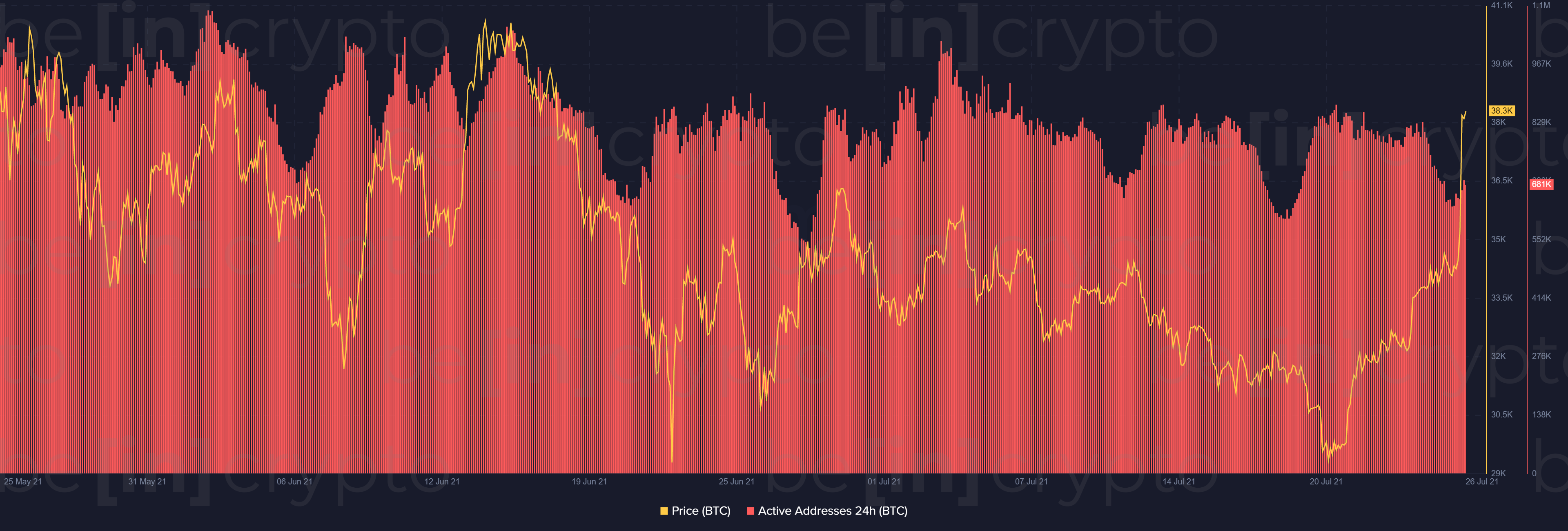 Упадок сохраняется даже несмотря на то, что за минувшие сутки биткоин подорожал на 11,5%. Так, объем таких адресов составляет 681,9 тыс. кошельков. Для сравнения, в последний раз, когда цена биткоина была выше $38 000, число активных адресов превышало 900 тыс. кошельков.