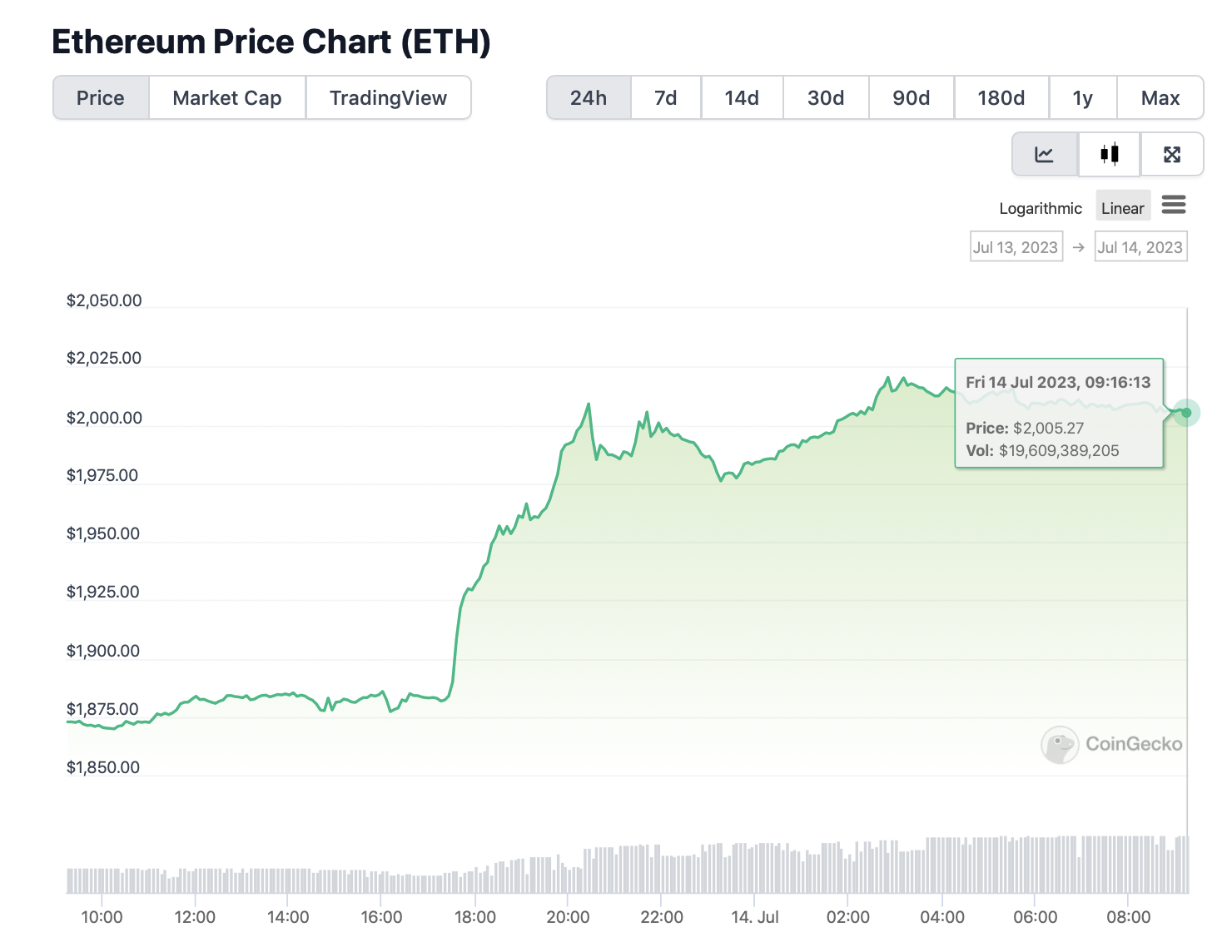 Ethereum, в свою очередь, прибавил в цене 7,1% и пробил ключевое сопротивление в $2000 — на момент написания актив торгуется выше этого уровня.