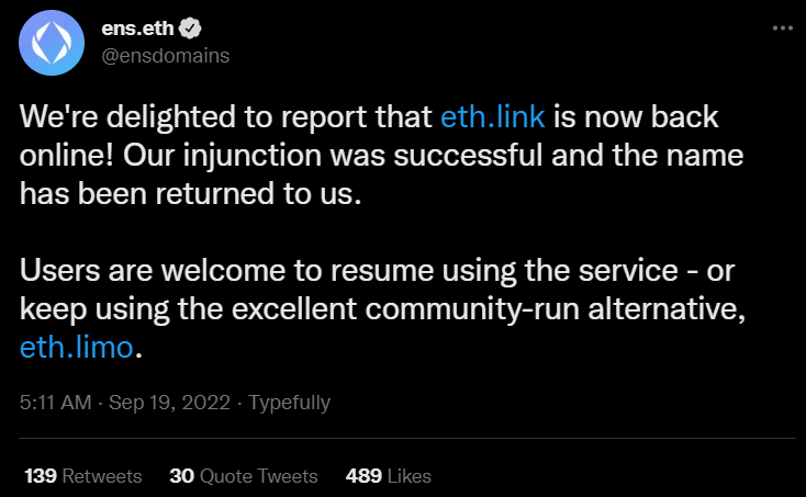 Web3-регистратор доменов Ethereum Name Service (ENS) вернул контроль над доменом eth.link. Об этом представители сервиса сообщили у себя на странице в твиттере.