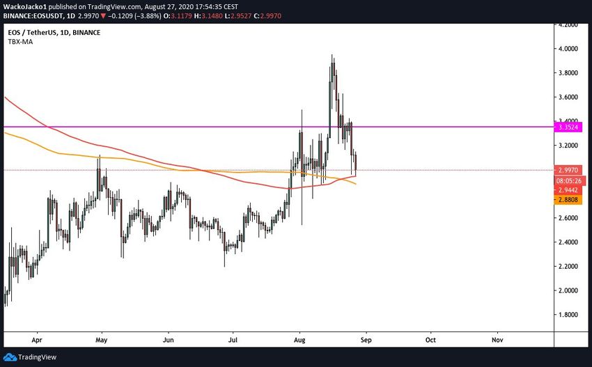 Альткоин EOS (EOS) пробил линию сопротивления от мая 2019 года, но не смог удержаться на достигнутых уровнях и к настоящему моменту откатился в район поддержки $3. Пока цена находится над этим уровнем, вероятность возобновления роста остается высокой.