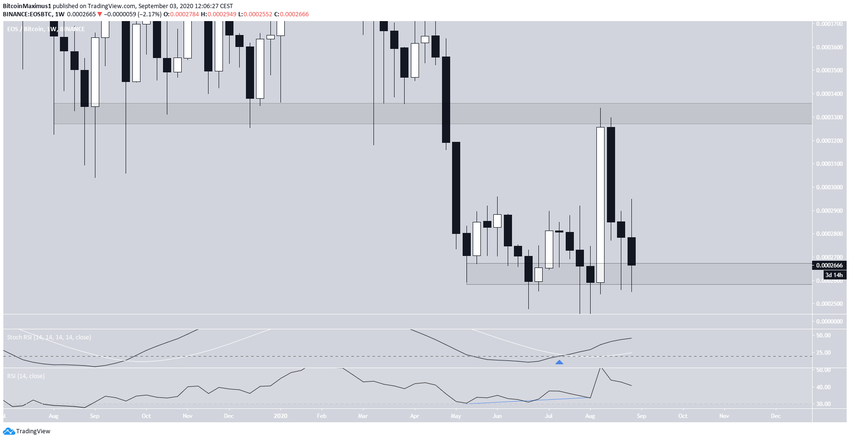 График пары EOS/BTC рисует благоприятную картину. Котировки находятся в районе поддержки 26 300 сатоши, которая проходит неподалеку от рекордного минимума. Кроме того, недельный RSI подает существенные сигналы бычьей дивергенции, а стохастик RSI сформировал бычье пересечение.